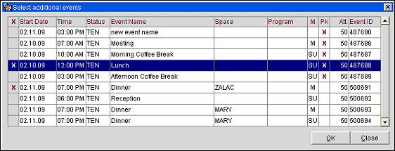 The Select Additional Events screen lists all events for the same business block along with the Start Date, Time, Status, Event Name, Function Space, Program, Master (M), Sub (SU), or Alternate (A), whether the event is part of a catering package (PK), Number of Attendees (Att.) and the Event ID.