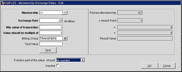 Exchange Rate. Enter the amount each point (or mile) will be converted from 1 Primary membership award point  (For example, if 15 is entered, 15 frequent flier miles will get converted from 1 guest loyalty award point. Therefore, when 10 Primary membership points are transferred to the frequent flier membership, the exchange rate converts to 150 miles which are added to that frequent flier membership.)